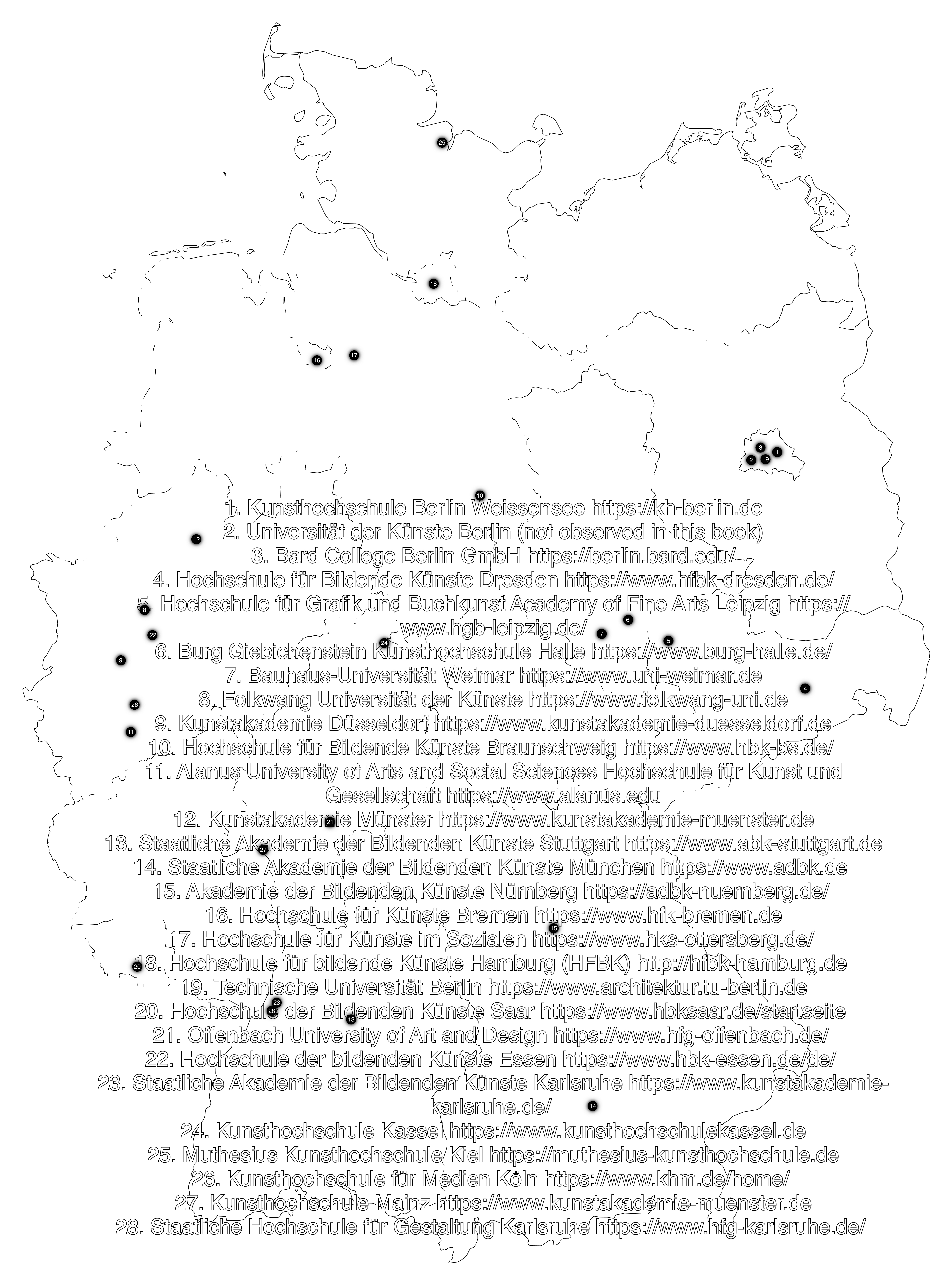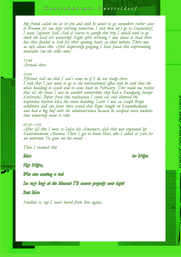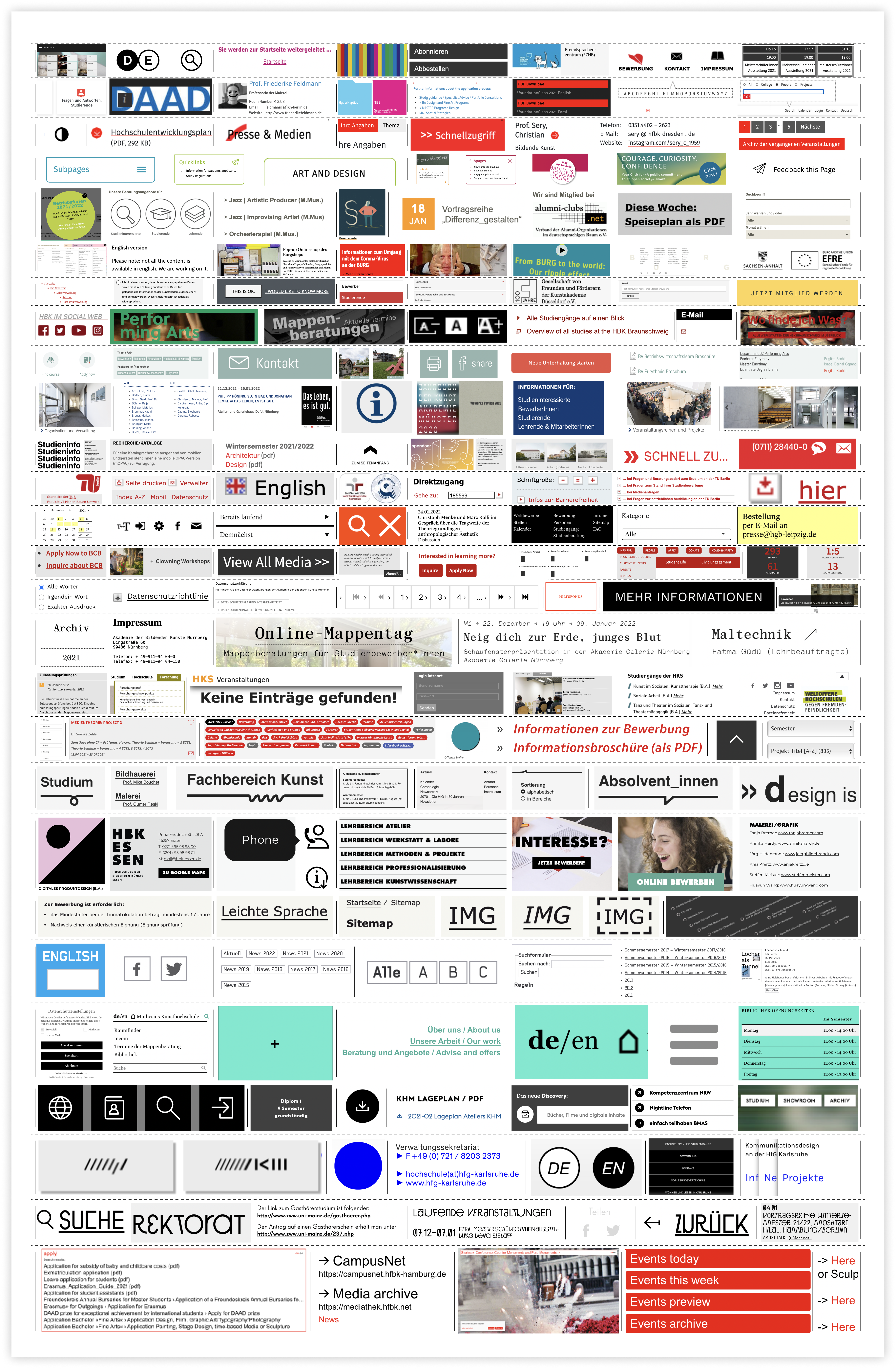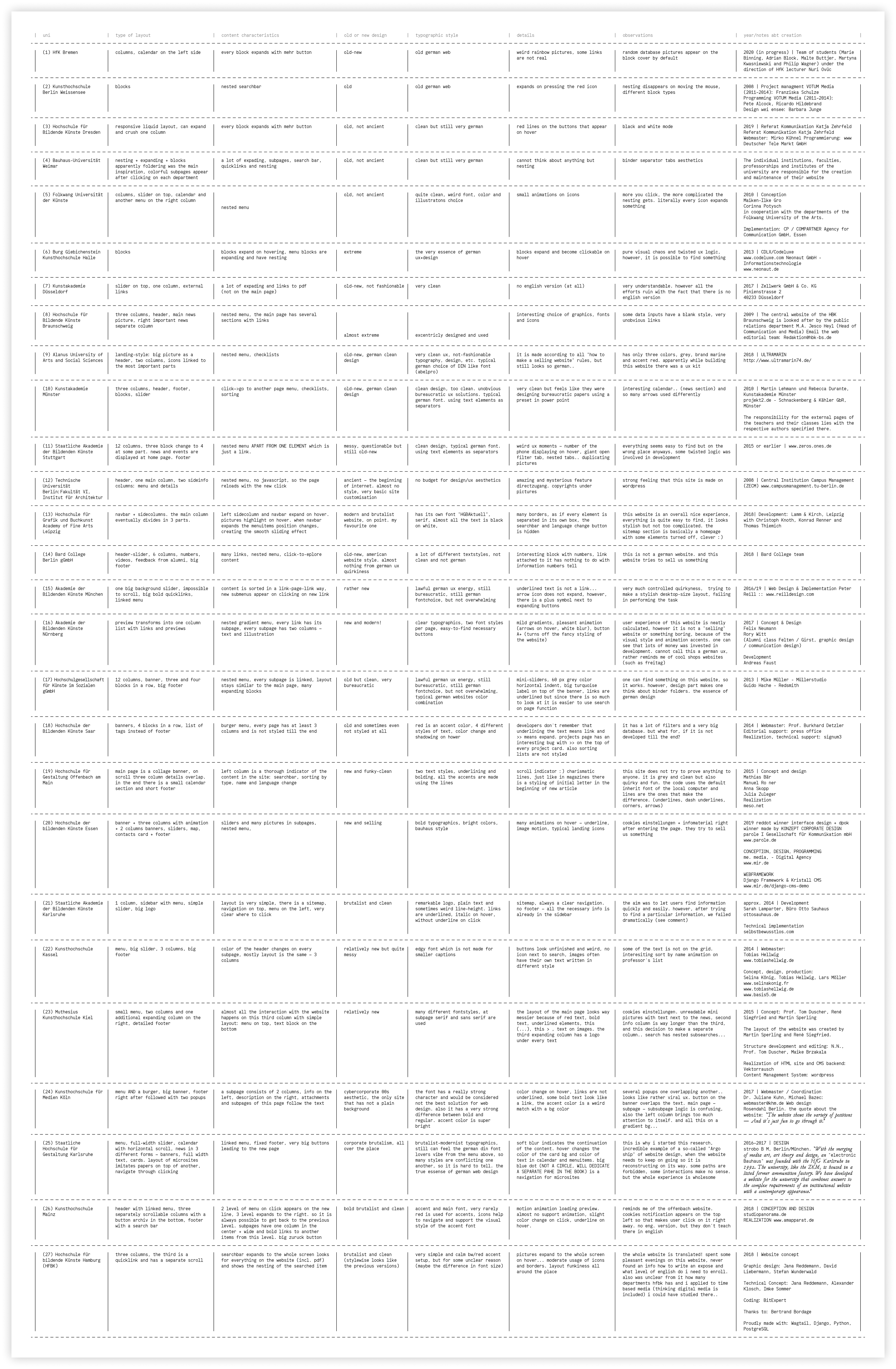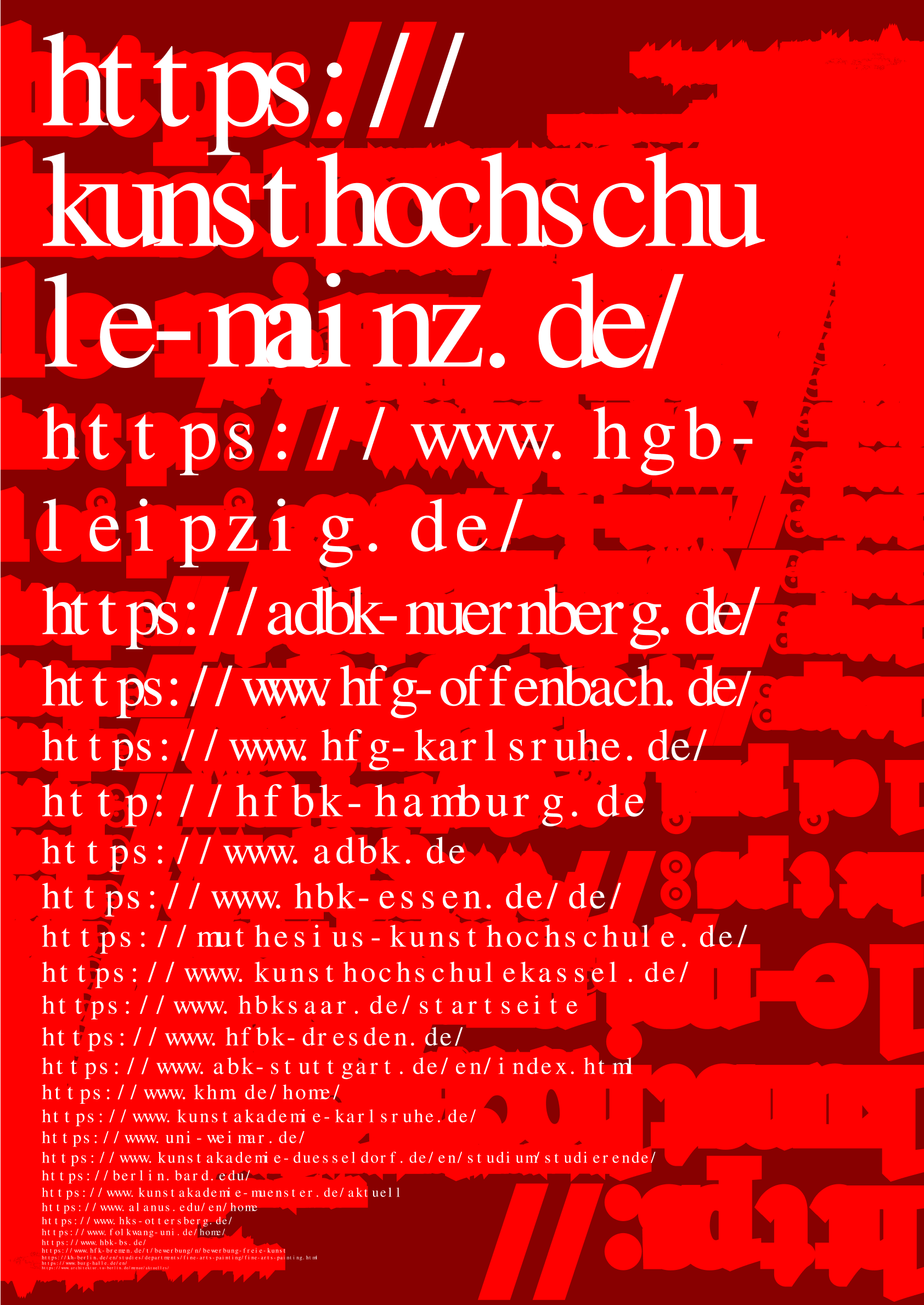 These URLs will save the IRL is a result of a two-year-long speculation on the topic of German art schools’ websites. The project started a hypothesis that German art schools sometimes deliberately create opaque interaction patterns to create an obstacle for potential applicants. During the research, I conducted UX tests, accessed archived versions of the websites, made design/UX analysis, comparison tables, wrote a manuscript, and travelled on the spot undercover to compare the website and real-life accessibility. This turned into the publication, written by me and collaboratively designed by 25 students of University of Arts Bremen and Klasse Digitale Grafik Hamburg.